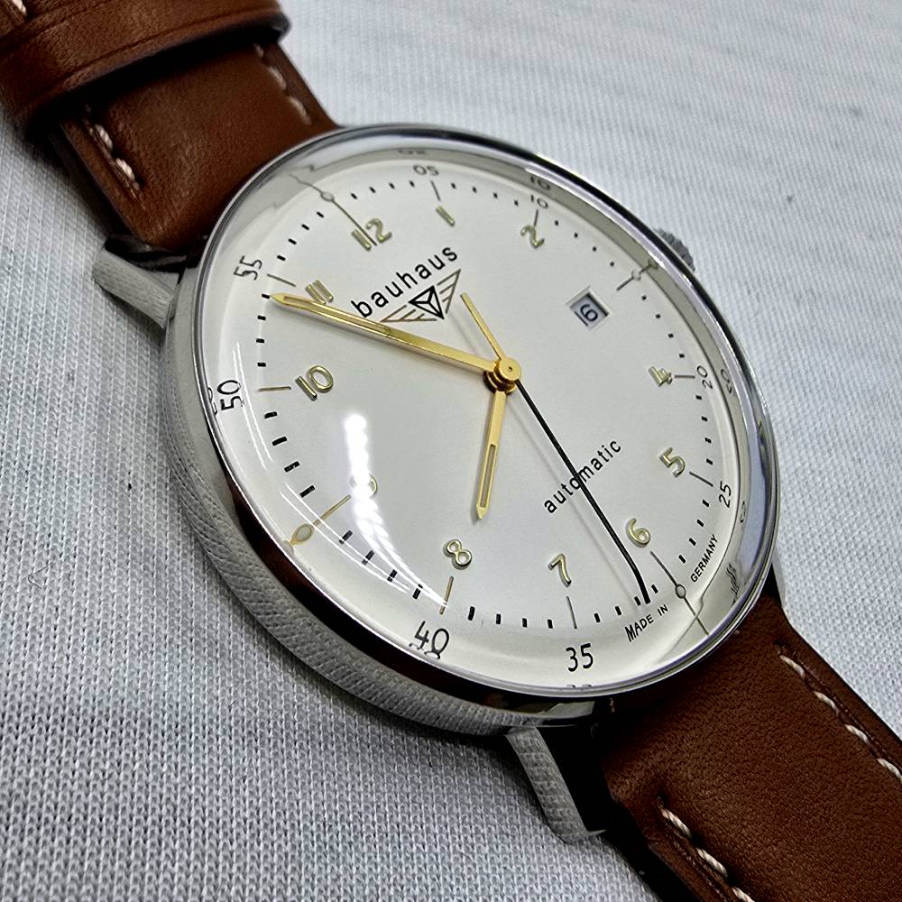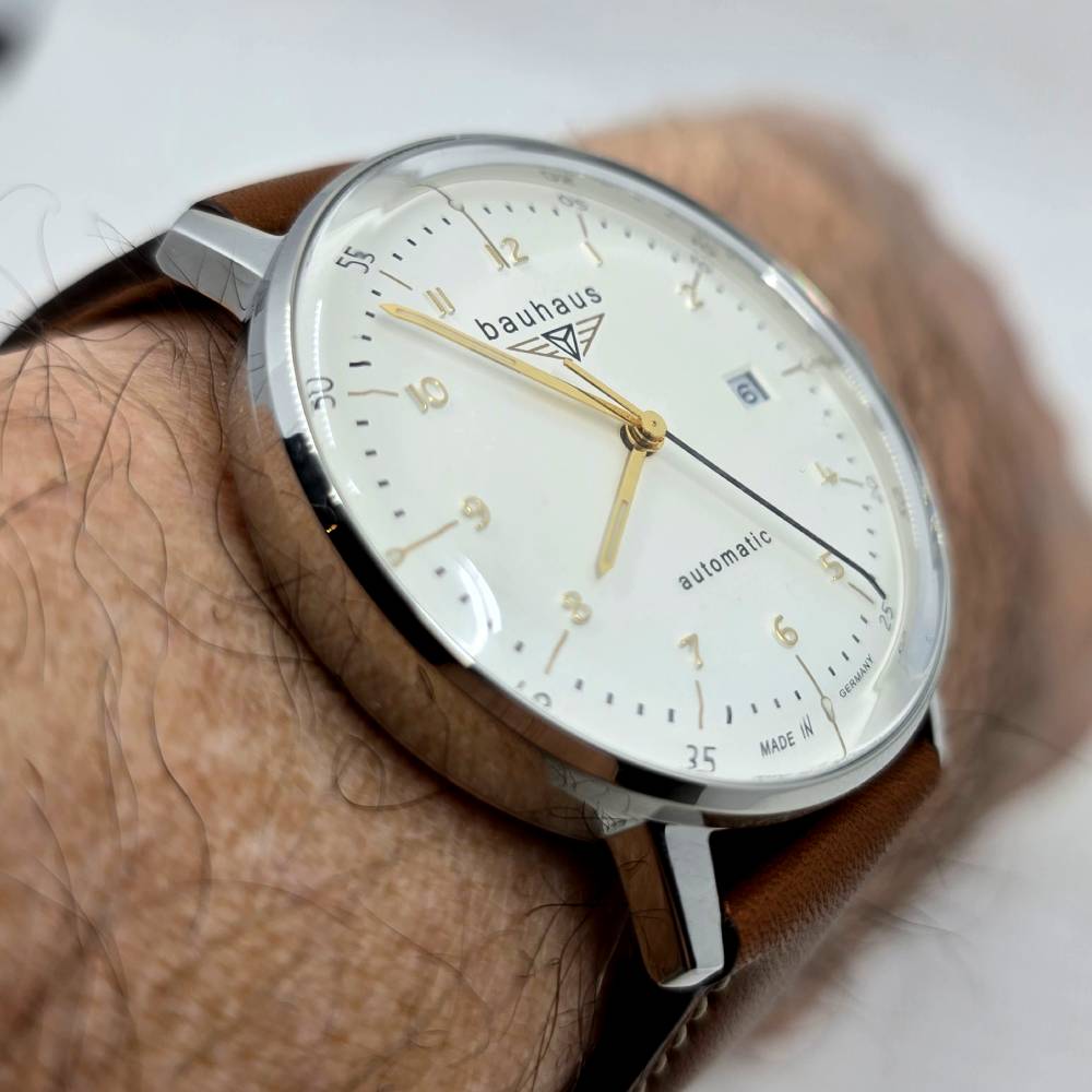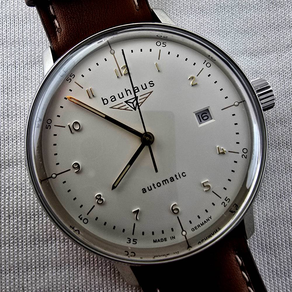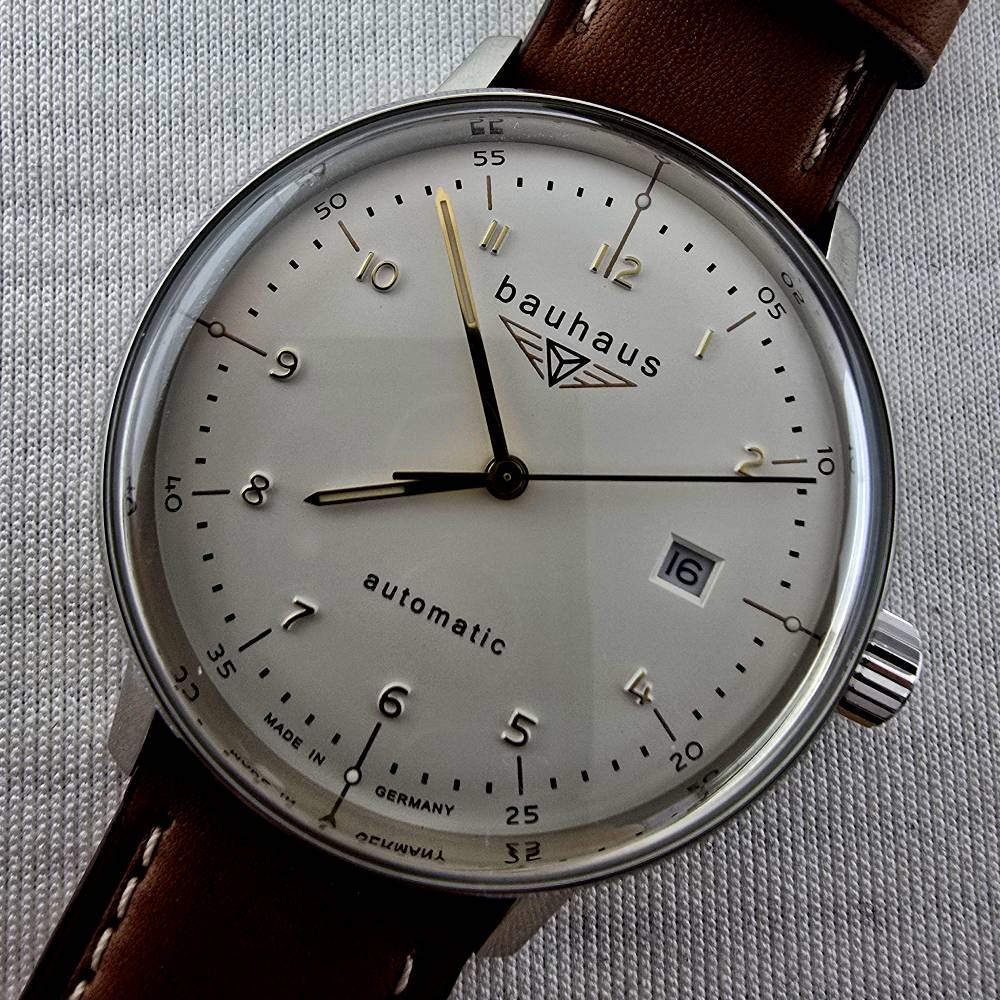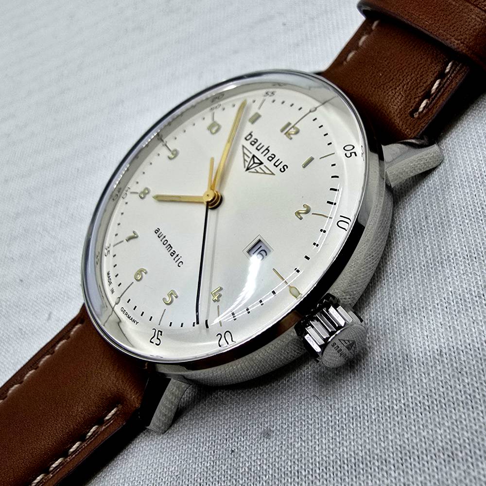 Bauhaus Dessau 2064-1 watch with Japanese automatic movement, stainless steel case, and leather strap. Minimalist German design, elegant, and highly legible.