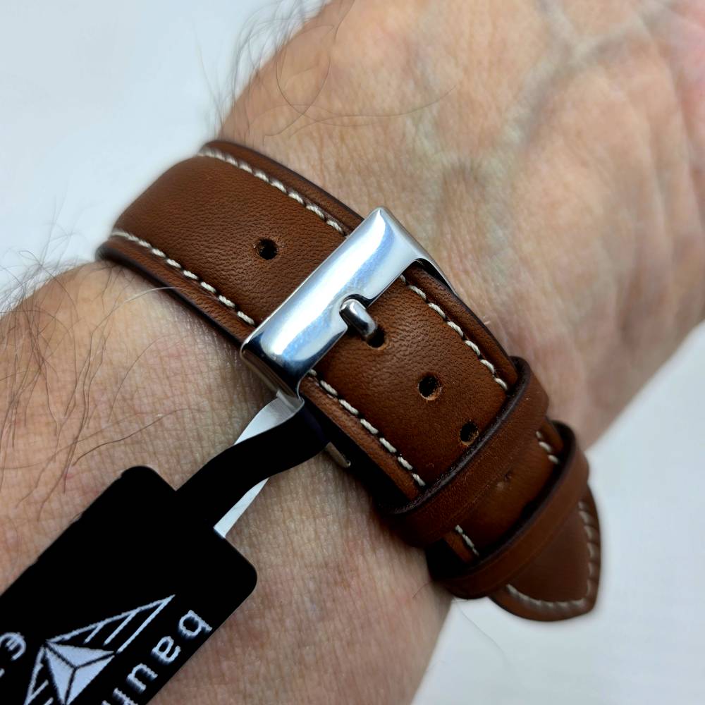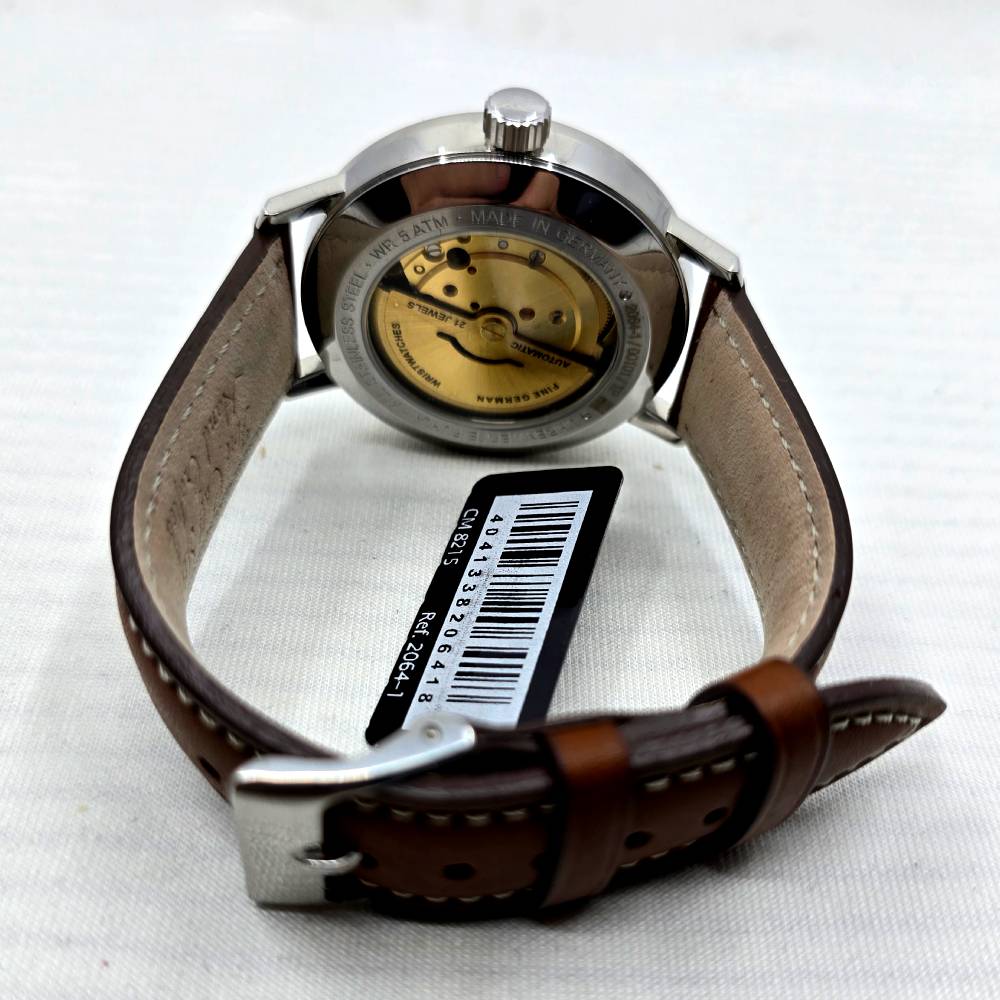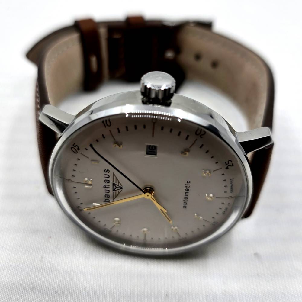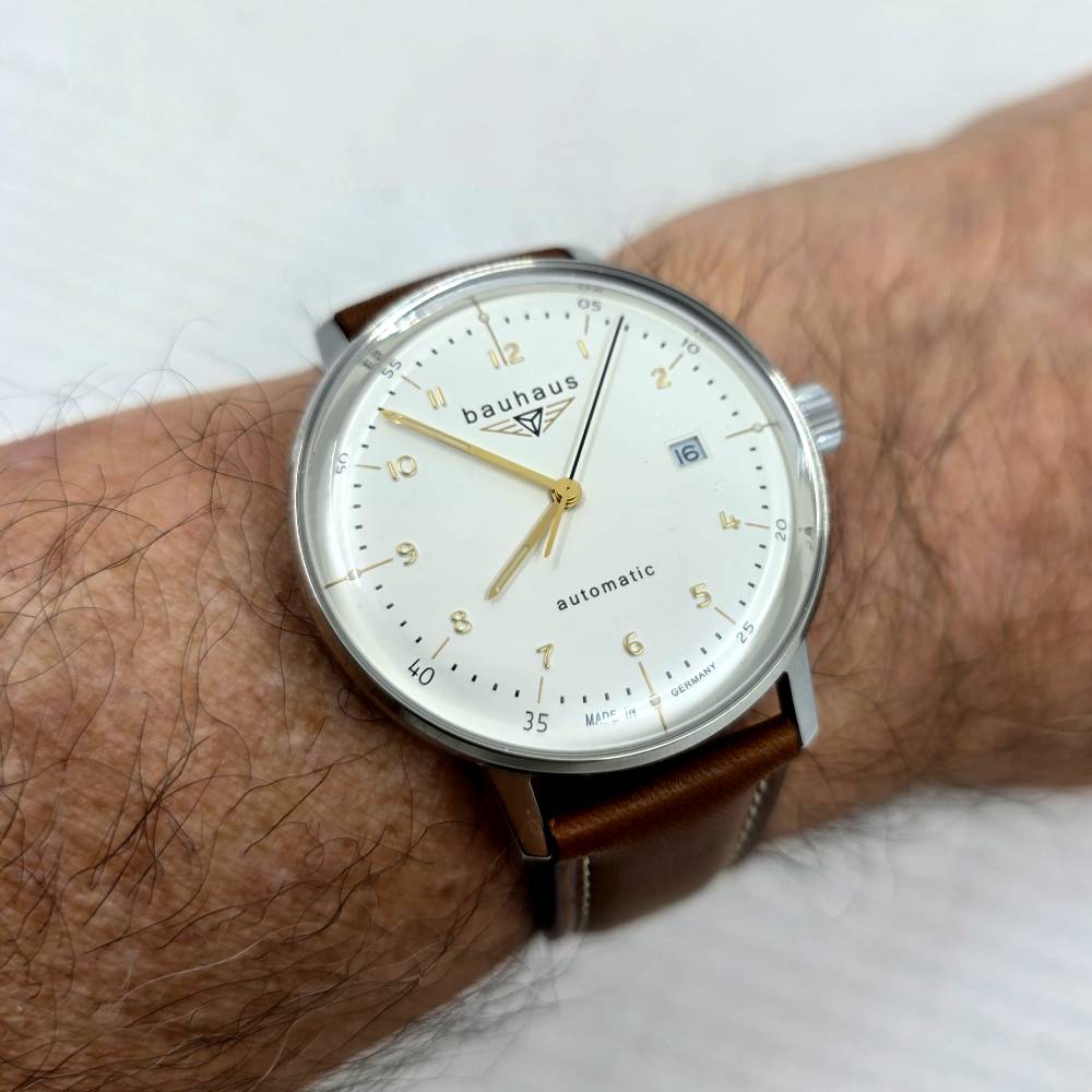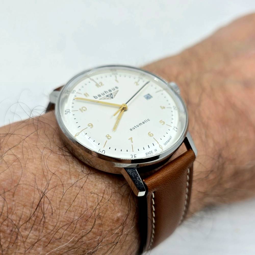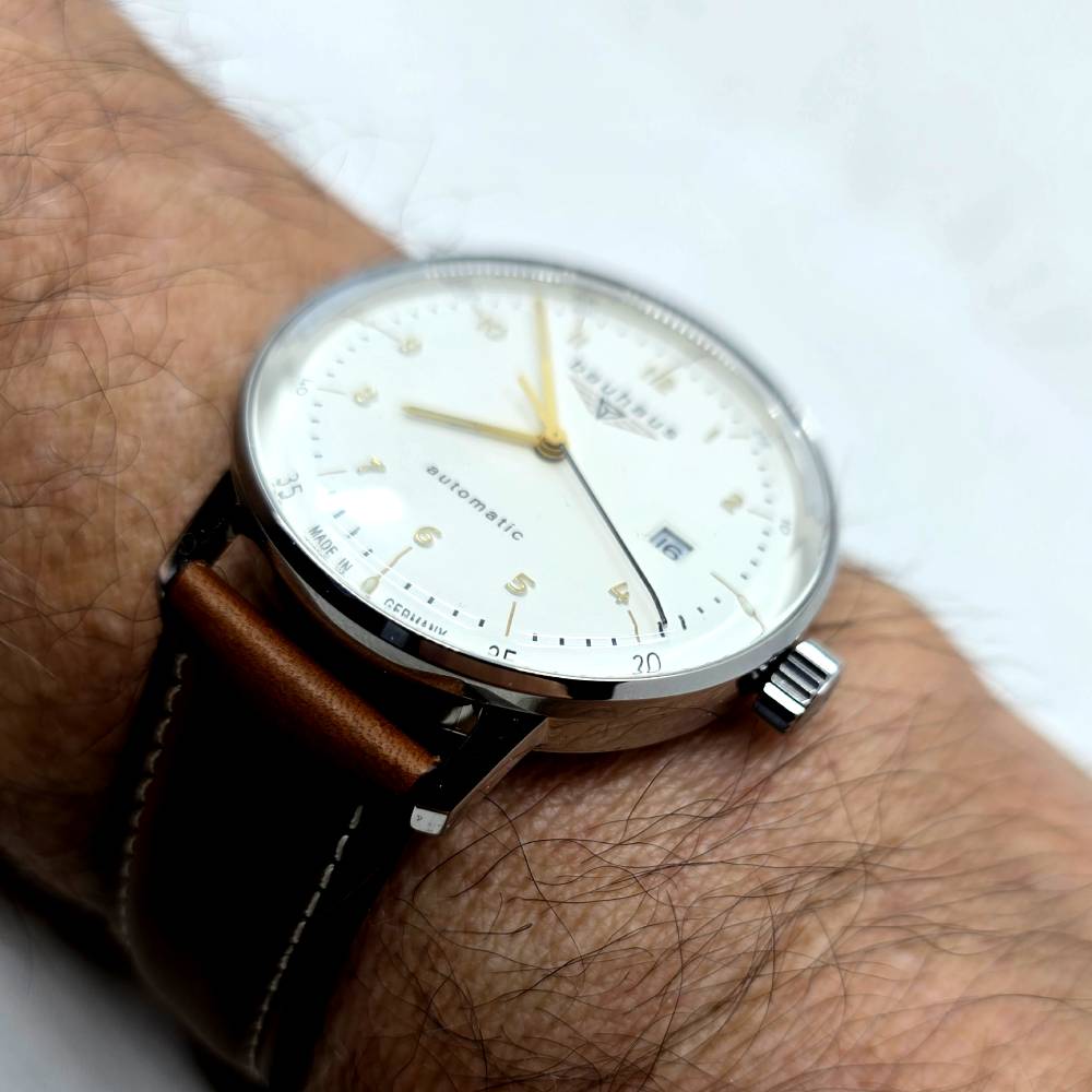 Bauhaus Dessau 2064-1 watch with Japanese automatic movement, stainless steel case, and leather strap. Minimalist German design, elegant, and highly legible.