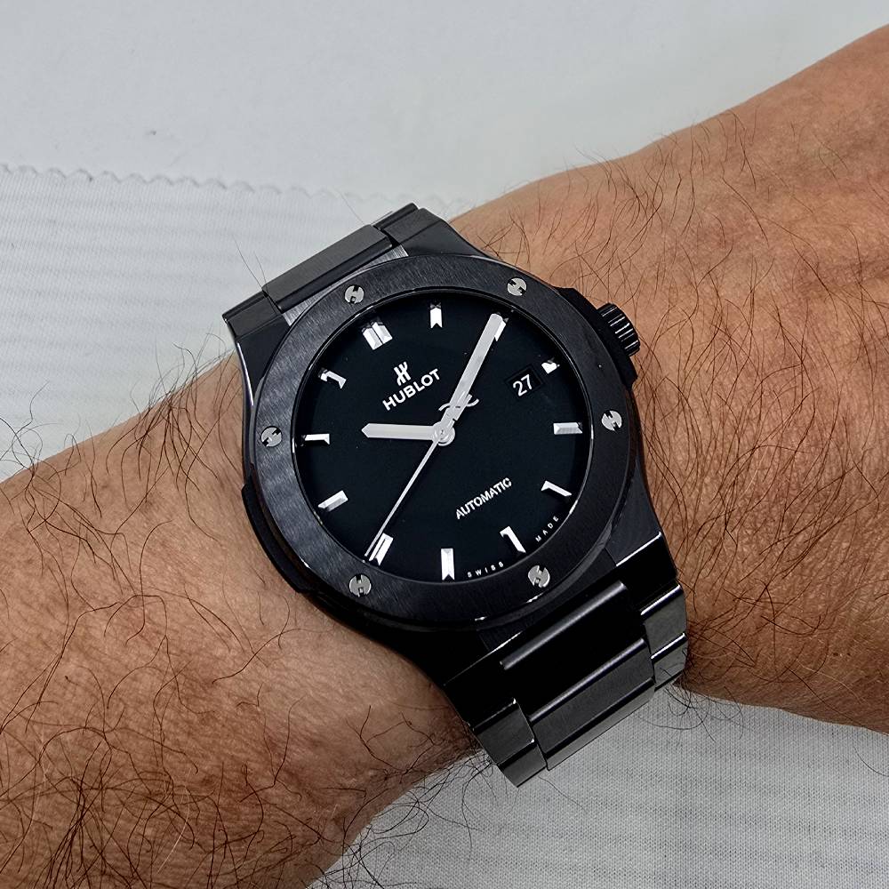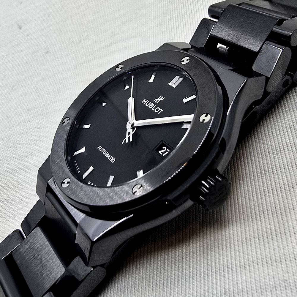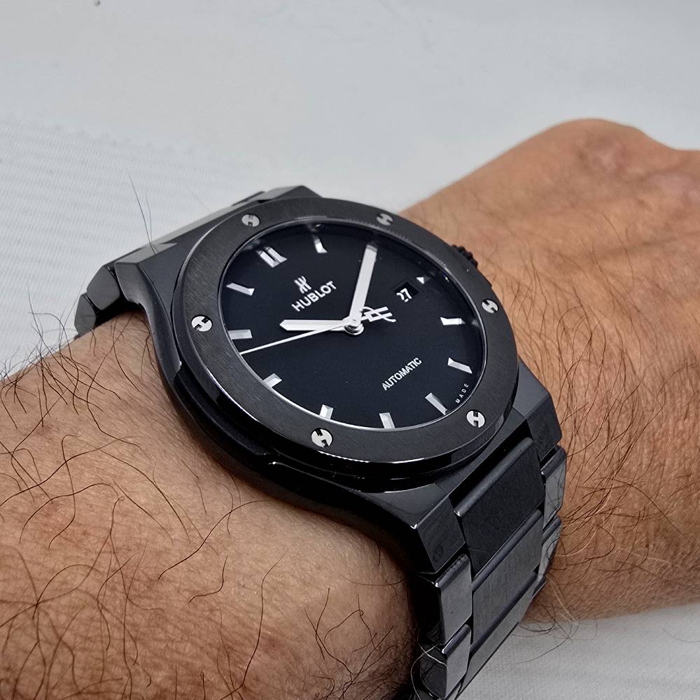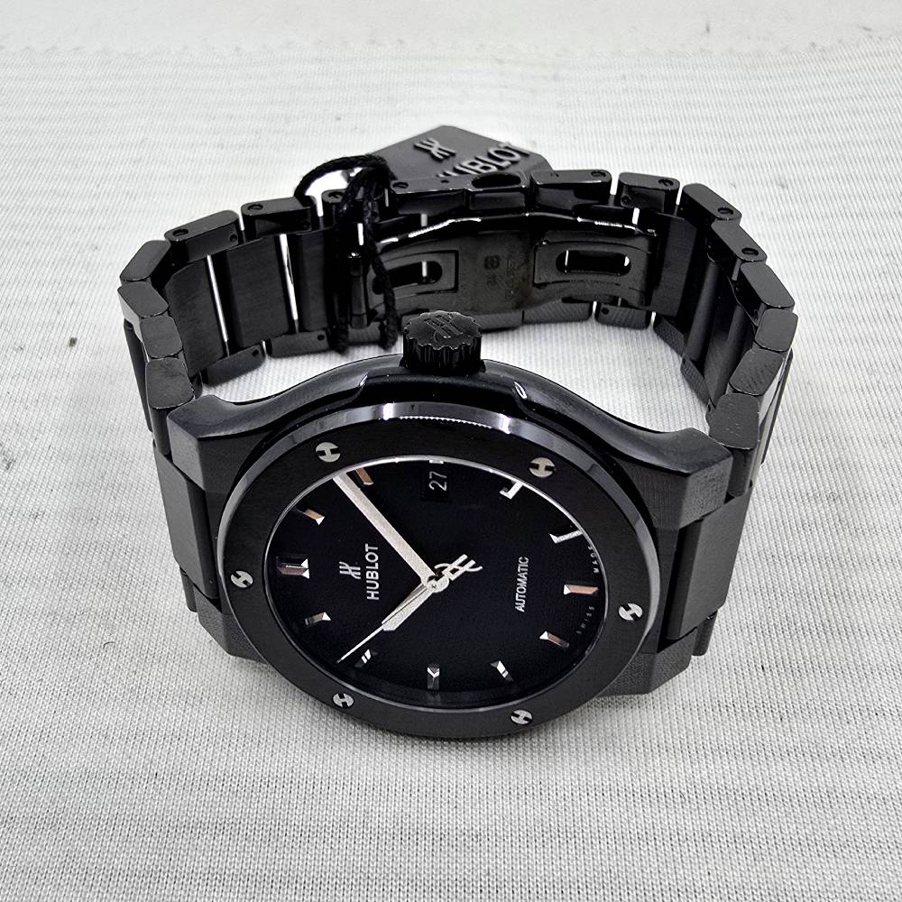 Hublot Classic Fusion Black Magic 548.CM.1170.CM, with automatic movement HUB1110, ceramic case and strap, black dial, 42 mm diameter, ceramic bracelet, 5 ATM water resistance, with original box, papers and warranty.