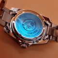 La esfera negra presenta índices y manecillas luminosas, lo que facilita la lectura en condiciones de poca luz. El bisel giratorio unidireccional permite medir el tiempo de inmersión.