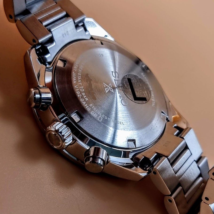 Equipado con un movimiento solar Seiko Caliber V192, que convierte la luz en energía, eliminando la necesidad de cambiar baterías. Este movimiento ofrece una precisión excepcional y una reserva de marcha de hasta 6 meses con carga completa.