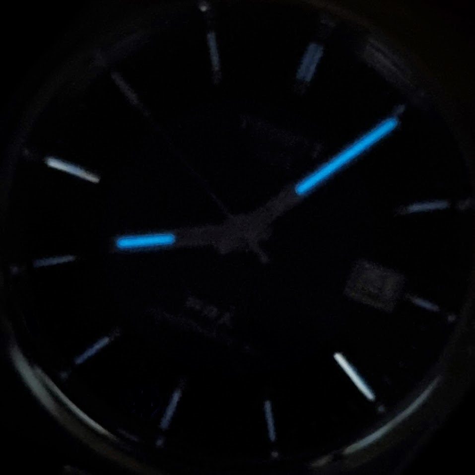 Calendario a las 3., Guillocheada., Índices luminiscentes., Manecillas luminiscentes., Segundero central.